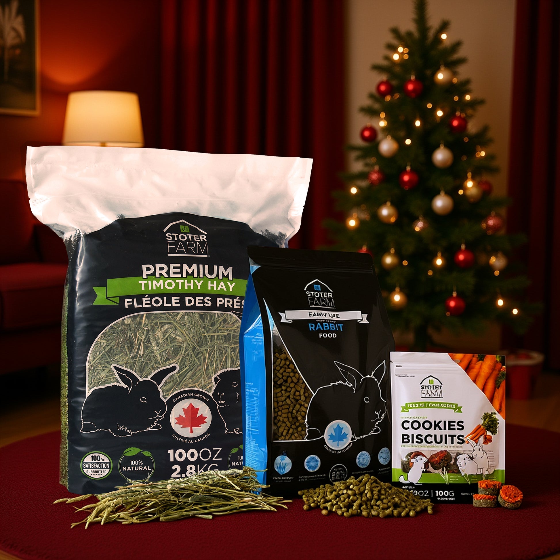 Celebrate the holidays with the Stoter Farm Holiday Bundle, designed for young rabbits. This festive set includes premium Timothy hay for healthy chewing and digestion, early life rabbit food for balanced growth and nutrition, and mini carrot cookies for a tasty seasonal treat. Perfect for encouraging healthy habits and playful exploration, this bundle combines nourishment, enrichment, and festive fun, making it an ideal way to spoil your growing rabbits during the holiday season.