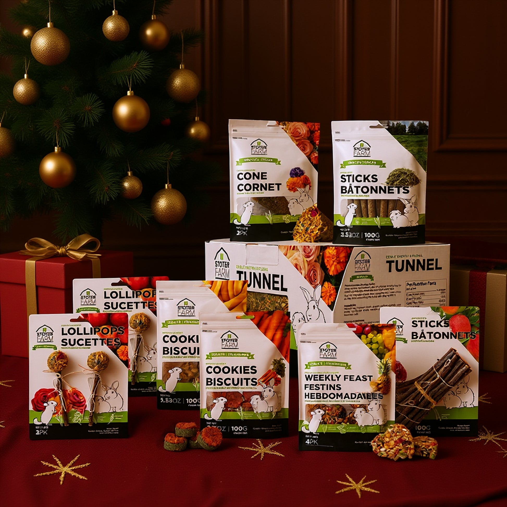 Bring holiday cheer to your small pets with the Stoter Farm Holiday Bundle. This festive assortment is filled with tasty treats, including mini banana and carrot cookies, apple and floral lollipops, weekly feast hearts, and crunchy sticks for healthy chewing. The Timothy & Floral cones and Timothy flower tunnel provide enrichment and playful exploration. Perfect for rabbits, guinea pigs, and other small animals, this bundle combines seasonal joy, nutritious treats, and hours of fun.