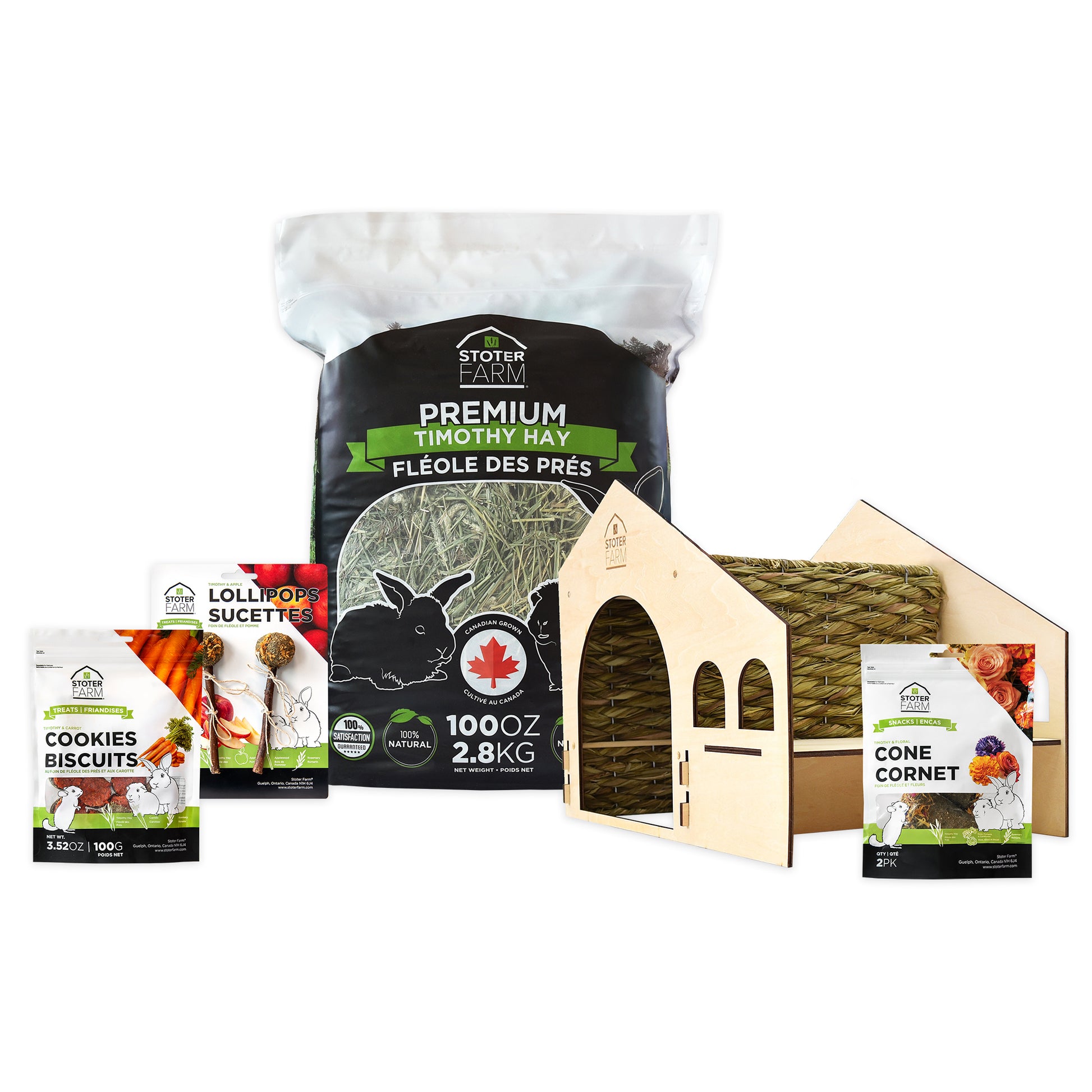 Celebrate the holidays with the Stoter Farm Holiday Bundle, designed to delight small pets. This festive collection features premium Timothy hay for healthy chewing and digestion, a Roof Top Condo pet house for cozy play, and seasonal treats like mini carrot cookies, floral lollipops, and Timothy & Floral cones. Perfect for rabbits, guinea pigs, and other small animals, this bundle encourages foraging, exploration, and snacking, bringing festive joy and enrichment to every day.